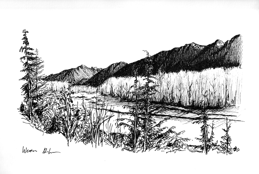 Custom black and white pen drawings on high-quality paper. All pieces are hand-drawn by Weston Baker.